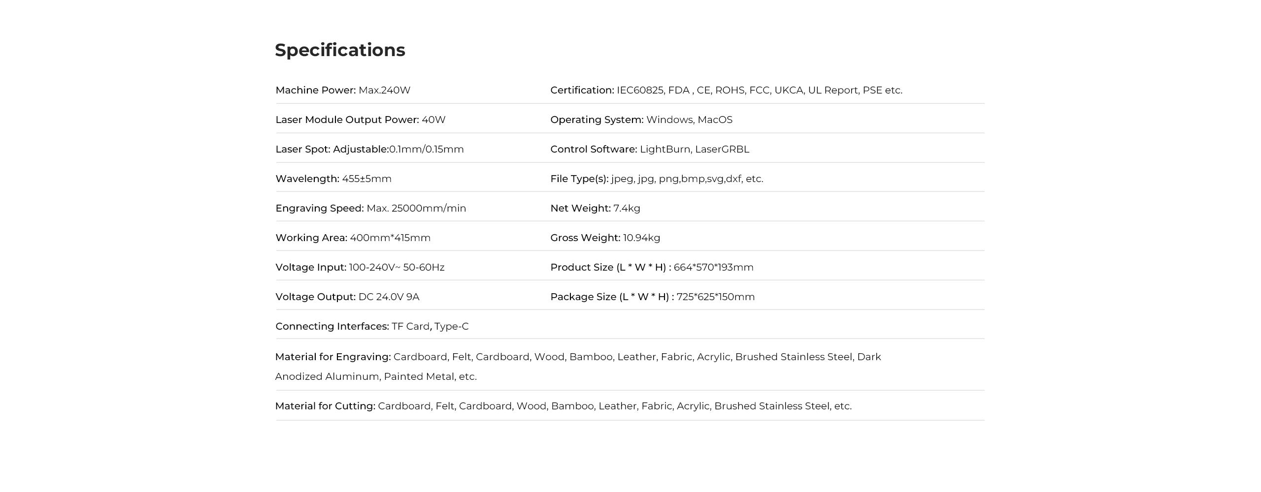 Сумісні матеріали Матеріал для гравіювання: картон, повсть, картон, дерево, бамбук, шкіра, тканина, акрил, матова нержавіюча сталь, темний анодований алюміній, пофарбований метал і т. д. Матеріал для різання: картон, повсть, картон, дерево, бамбук, шкіра, тканина, акрил.