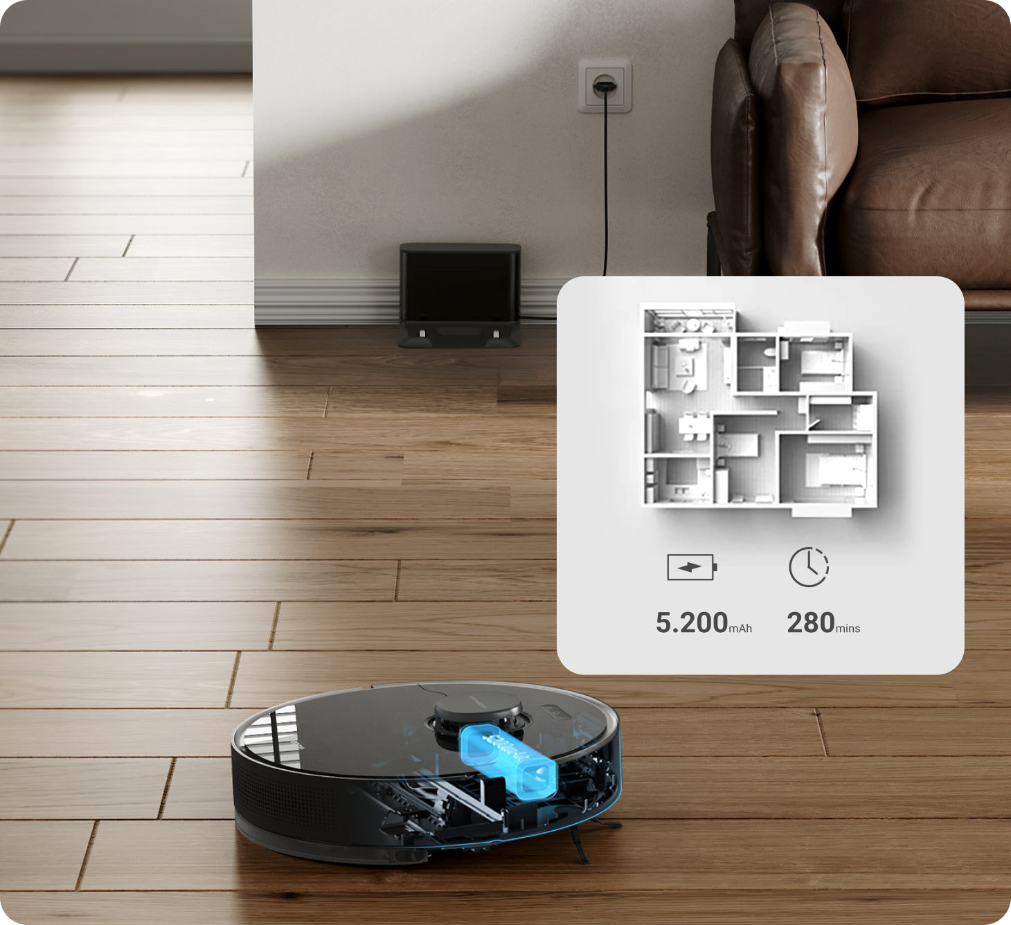 Насолоджуйтесь з кута в кут система очищення з акумулятором ємністю 5200 мАч забезпечує безперервне очищення до 280 хвилин. Коли живлення закінчується, ваш робот автоматично повертається для підзарядки, а потім починає збирання з того місця, на якому зупинився, щоб забезпечити чистоту всього вашого будинку.