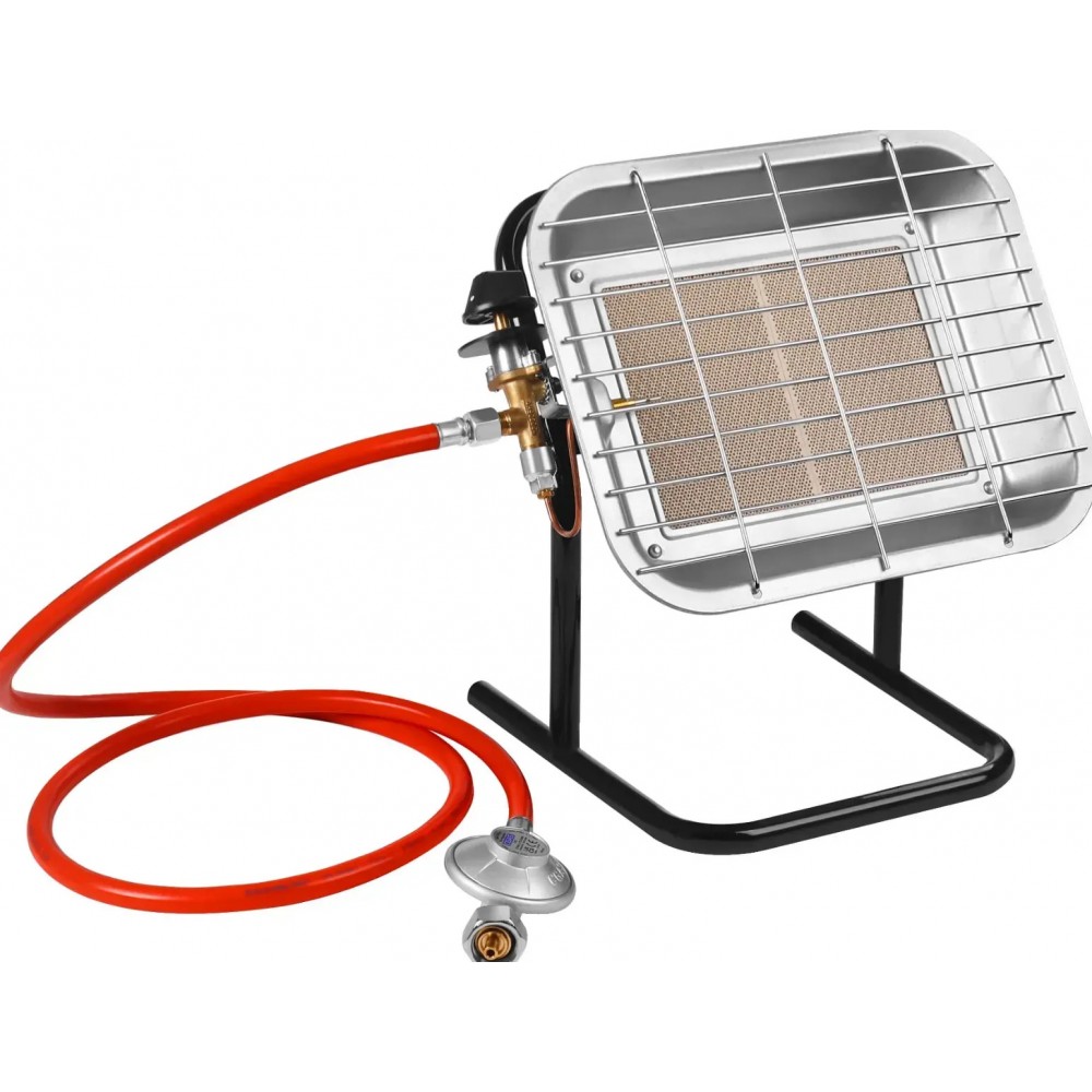 Обігрівач оснащений міцною підставкою, великою нагрівальною поверхнею та виготовлений з високоякісних матеріалів, що забезпечує швидке нагрівання та довгий термін служби. Редукційний клапан і шланг для балона гарантують безпечне та зручне використання.