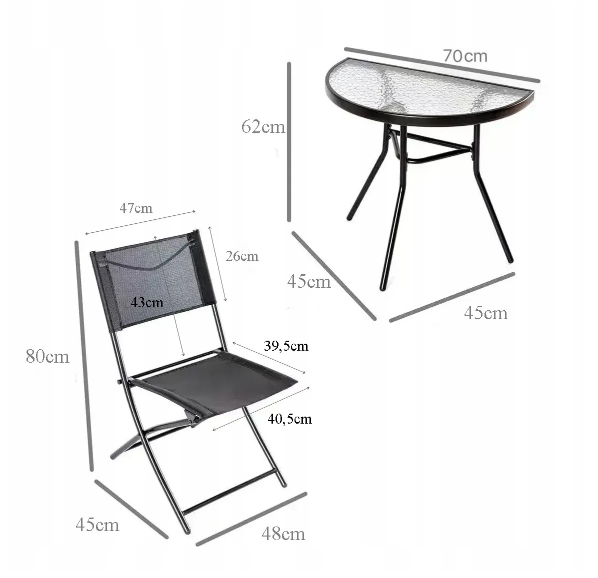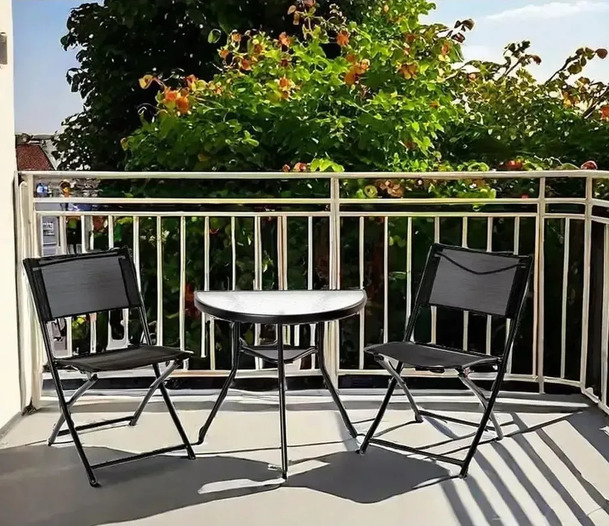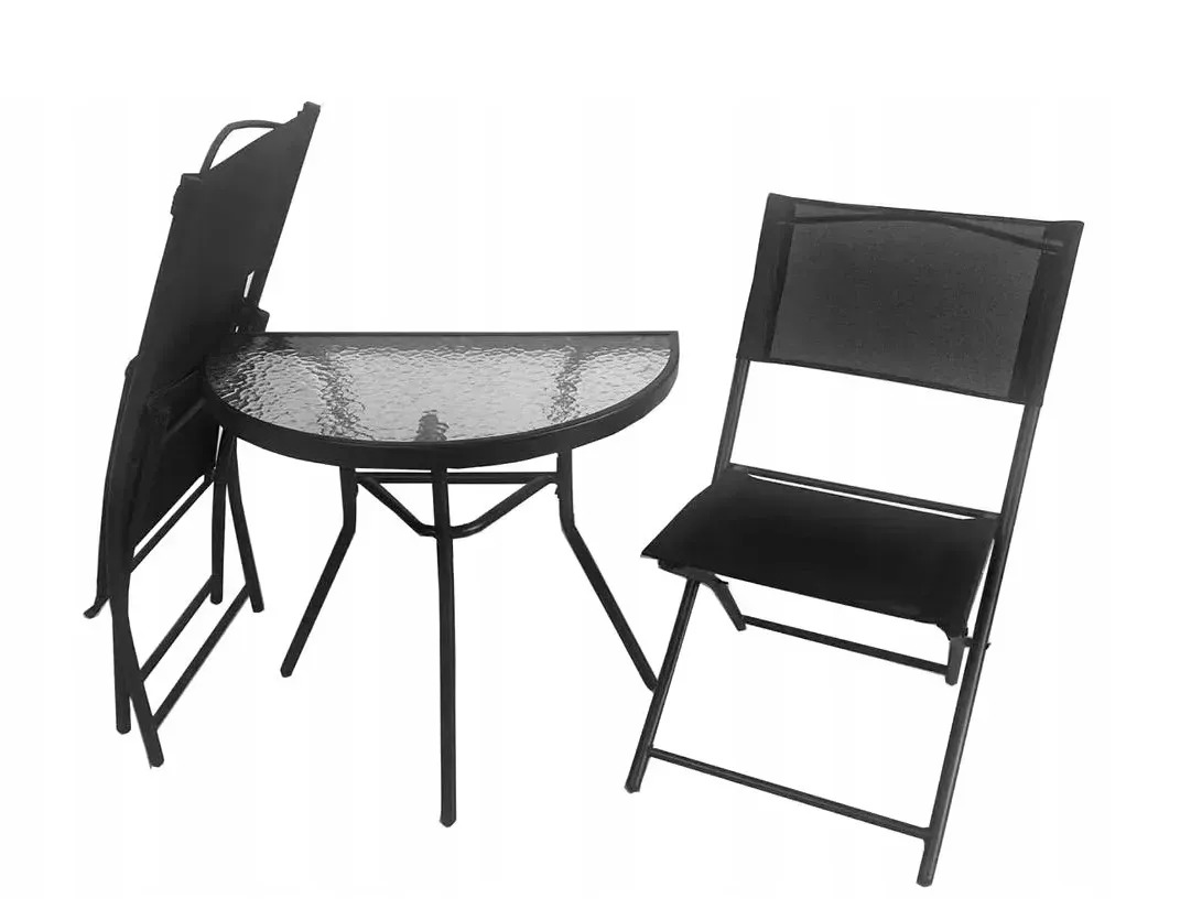 Комплект складається з напівкруглого столу та двох складних стільців, що дозволяє максимально ефективно використовувати простір. Завдяки компактності меблі легко розміщуються навіть у вузьких зонах, не перевантажуючи інтер'єр.