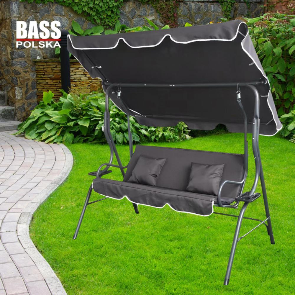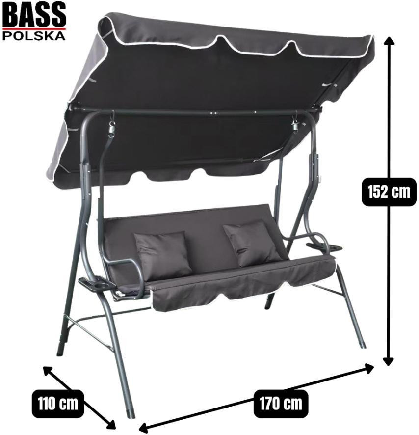 Гойдалка садова тримісна 170x110x153 см Bass Polska BH 10030 з підсклянниками та подушками, колір антрацит.