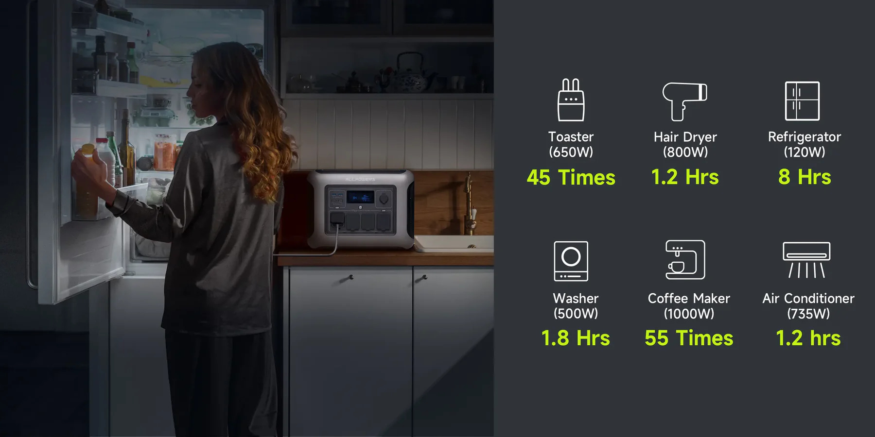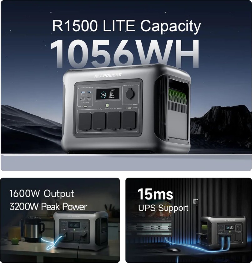 Завдяки вихідній потужності змінного струму 1600 Вт та ємності 1056 Вт·год, R1500 LITE забезпечує надійне харчування для походів, надзвичайних ситуацій вдома та пригод на природі – і все це за неперевершеною ціною. Незалежно від того, чи використовуєте ви пристрій CPAP вночі, забезпечуєте харчування в кемпінгу або забезпечуєте роботу необхідних пристроїв під час відключення електроенергії, R1500 LITE – це доступне, легке та універсальне рішення для живлення, на яке ви так довго чекали.
