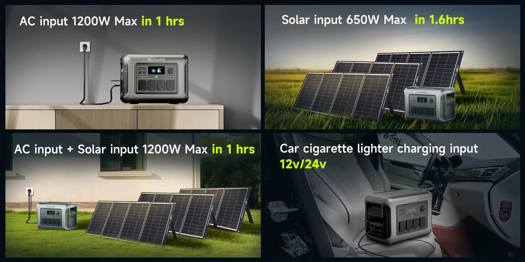 R1500 LITE забезпечує заряджання в будь-якій ситуації завдяки кільком надійним варіантам заряджання. Поповнюйте заряд від 0 до 100% лише за 60 хвилин (максимум 1200 Вт) за допомогою розетки; використовуйте сонячну енергію максимум 650 Вт для автономних пригод; легко заряджайте зарядку під час водіння (ідеально підходить для подорожей); об'єднайте обидва джерела для надшвидкої гібридної зарядки, що ідеально підходить для надзвичайних ситуацій або сонячних днів. Він також має інтелектуальні 3-ступінчасті режими заряджання. Створений для кемпінгу, резервного копіювання будинку, кемперів та роботи на відкритому повітрі R1500 LITE адаптується до ваших потреб в енергії з неперевершеною швидкістю та інтелектом.