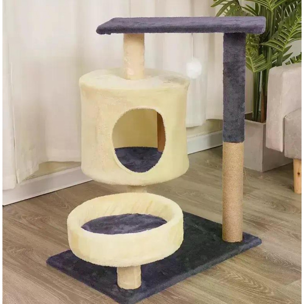 Функціональний і стильний ігровий комплекс для котів з поличками та будиночком. Стійка багаторівнева конструкція дозволяє вашому улюбленцю активно гратися, лазити, відпочивати та доглядати за кігтями.